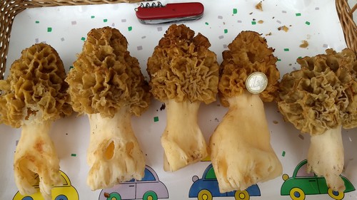 "Dorothee und ich konnten unsere abermalige Morchelsuche bei Hofbieber unter Eschen auf Kalk (Anzeiger: Weinbergschnecken!) gut beladen beenden. 30 Speisemorcheln, darunter auch die fünf großen auf dem zweiten Bild, konnten wir finden. Das Taschenmesser und die 1-Euro-Münze sollen ihre Größe verdeutlichen." (2 Fotos © Peter C.)