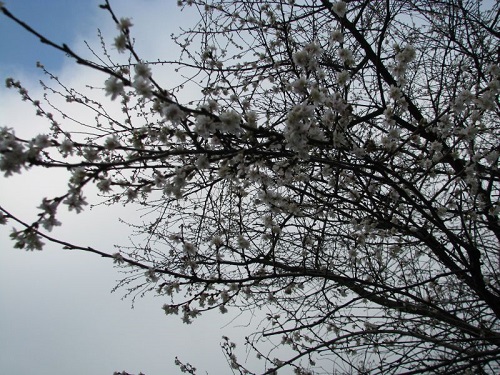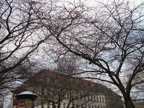 So blühen an der Ecke Klingen-/Rolf-Axenstraße bereits mehrere Japanische Kirschen wunderschön. Im Japanischen Garten des neuen Altenpflegeheimes Schwartzestr. blüht auch wieder die Winterschneewittchenzierkirsche und in einem Privatgrundstück die schöne Rote Zaubernuss.
