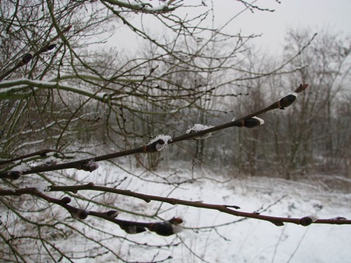 Foto: Weidenkätzchen im Schnee.