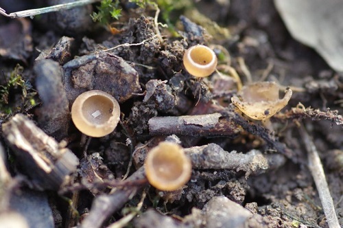 Foto: Haselkätzchenbecherlinge, Nahaufnahme, ungenießbar.