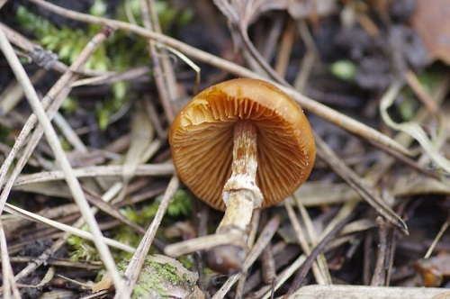 Foto: Nadelholzhäubling 2, sehr giftig, von unten. Selbst erfahrene Pilzsammler meiden Stockschwämmchen, weil sie manchmal schwer von Nadelholzhäublingen (Gifthäublingen) zu unterscheiden sind.