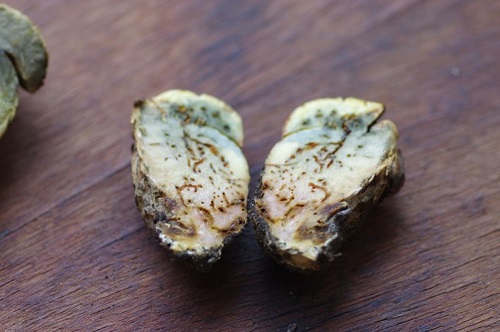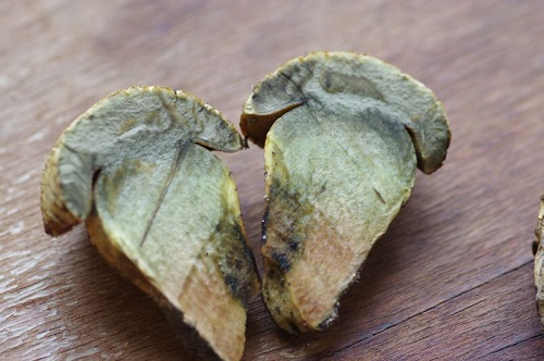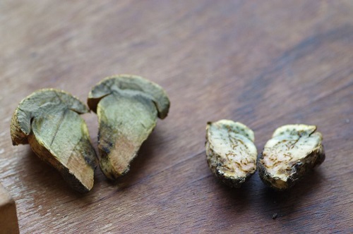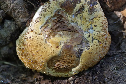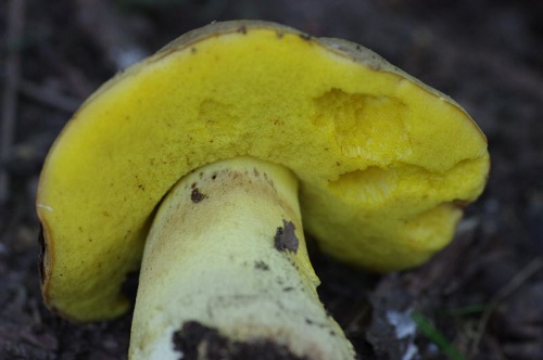 Foto: Wurzelnder Bitterröhrling 2, Querschnitt. Man beachte das namensgebende langgezogene Stielende, die "Wurzel". Ungenießbar.