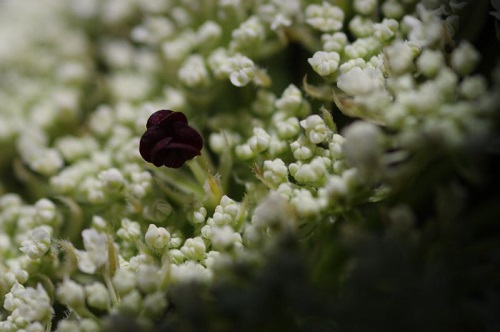 Die Nahaufnahme einer Wilden Möhrenblüte (Ein violetter Stempel inmitten hunderter weißer Blüten) lassen mich die essbare Wildmöhre von giftigen Arten unterscheiden. Die Wildmöhre ist weiß und schmeckt süßlich.
