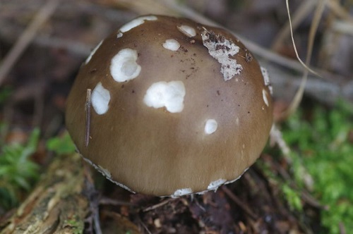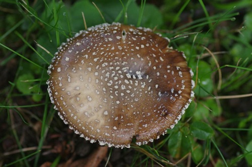 Foto: Pantherpilz 1: Er hat viele kleine weiße Flöckchen, die Hüllreste des Velum universale. Sein Hutrand ist gerieft, was vor allem bei älteren Pilzen deutlich hervortritt.