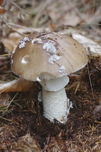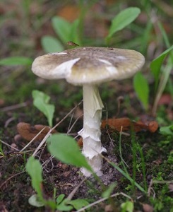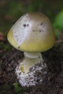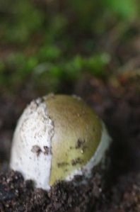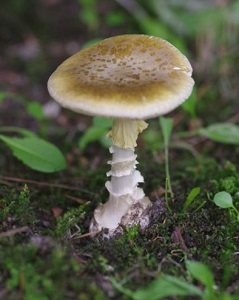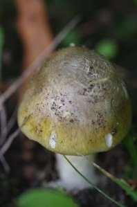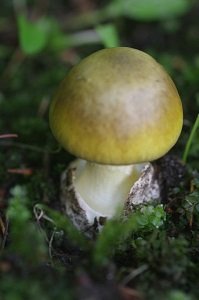 Foto: Wie ähnlich er dem Grünen Knollenblätterpilz doch sieht, dieser essbare Scheidenstreifling! Im Gegensatz zu dem tödlich giftigen Grünen Knollenblätterpilz ist sein Hutrand deutlich gerieft. Sein sichtlich längerer Stiel steckt in keiner Hülltasche. Er ist ein Wulstling ohne Wulst.