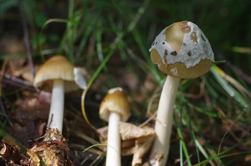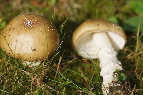 Foto: Pantherpilz 2: Der geriefte Hutrand ist auch bei dem jungen Pilz links schon zu sehen. Pantherpilze sind stark giftig, mitunter auch tödlich.