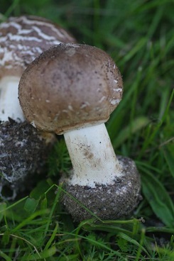 2 Fotos: Ein wichtiges Merkmal von Giftschirmlingen ist ihre markant gerandete Knolle, ähnlich wie beim Gelben Knollenblätterpilz. (4 Fotos © Peter Rohland)