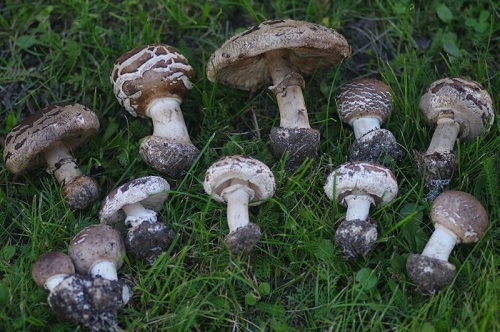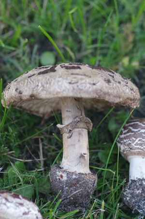 Foto: Giftschirmpilze in verschiedenen Wachstumsphasen. Besonders mit aufgeschirmtem Hut (siehe vor allem das große Foto) hält sie mancher Pilzsammler für Safranschirmlinge oder gar für Parasolen. Es sind sehr giftige Pilze!