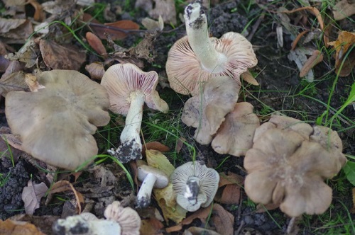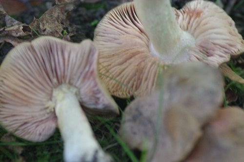 Foto: Der Gelbstich, der die Riesenrötlinge auszeichnet, ist auch auf dem Hut erkennbar, wenn auch schwach, siehe der Pilz ganz links. Man muss Riesenrötlinge drehen und wenden, um das Gelb als sehr wichtiges Merkmal für ihre Gefährlichkeit zu erkennen.