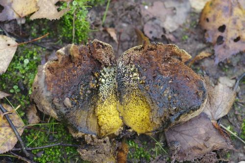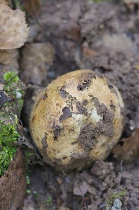 Foto rechts: Der Erbsenstreuling, auch Böhmische Trüffel oder Schiefertrüffel genannt, ist eigentlich ein hochsommerlicher Pilz. Weil aber die Natur Ausnahmen liebt, hat Peter Rohland diesen ausgezeichneten Würzpilz noch Ende Oktober gefunden. Weil er selten ist, sollte man ihn stehen lassen.