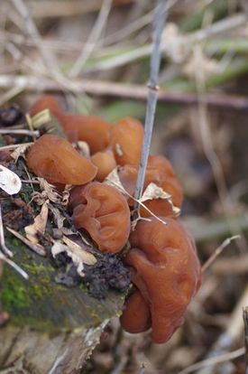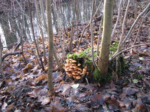 Erwähnenswert scheint mir noch eine frische Stinkmorchel mit Fliegen - außergewöhnlich für diese Jahreszeit. Bei der ehemals schönen Ausflugsgaststätte Wassergott an der Pleiße, die im Krieg vernichtet wurde, fand ich viele Orangeseitlinge, teilweise mit etwa 2 Millimeter kleinen Becherlingsartigen am gleichem Stamm. Ganz sicher, ob es nicht winzige kommende Orangeseitlinge sind, bin ich mir nicht. Schön stehen auch noch die Winterhelmlinge da.