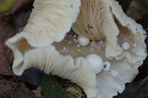 Foto: Nebelgrauer Trichterling (Graukappe, Nebelkappe) mit parasitischen Scheidlingen - Ungenießbar