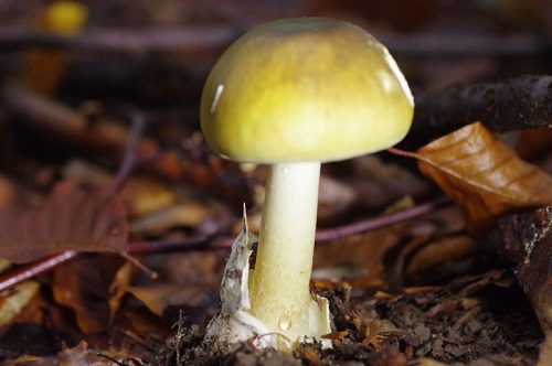 Foto: Grüner Knollenblätterpilz - Tödlich giftig - Gut zu sehen sind die Reste der Hülltasche (Volva) an der Stielbasis. Zu beachten ist der Farbübergang vom Grün zum Gelb. Deshalb niemals Gelbe Knollenblätterpilze sammeln, obwohl ihr Gift, das Bufotenin, beim Erhitzen zerfällt und der - minderwertig schmeckende - Gelbe Knollenblätterpilz somit theoretisch sogar verzehrt werden könnte.