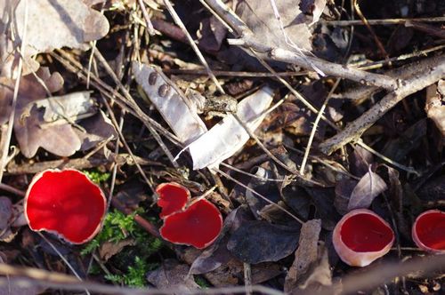 Die leuchtend roten Ösi-Prachtbecherlinge sind die letzten Winterpilze; man kann auch sagen, sie läuten den Pilzfrühling ein. Im Ablauf folgen dann die ersten Huflattichblüten zusammen mit den Lorcheln. Rund eine Woche später kommen die Tulpenbecher und die Böhmischen