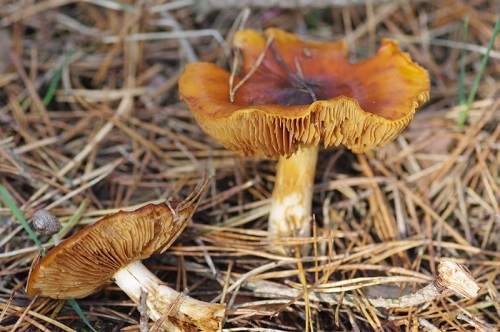Foto: Buckeltäublinge - Essbar. Sie sind, wie man hier an den Nadeln erkennt, strenge Kiefernbegleiter. Da sie jedoch fade sind und außerdem im Mischpilzgericht (leicht) rotviolett färben, stehen sie in Deutschland nicht auf der Liste der Speisepilze. In der Ukraine werden sie teils in Massen gesammelt und verzehrt.