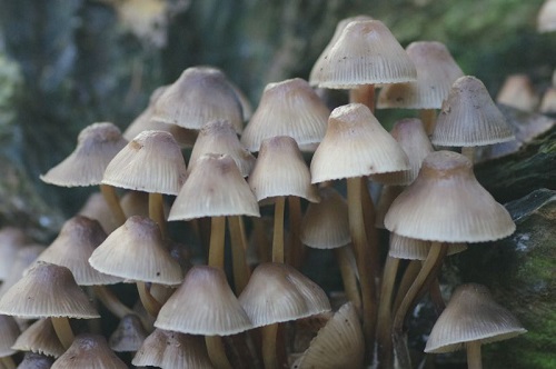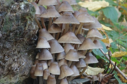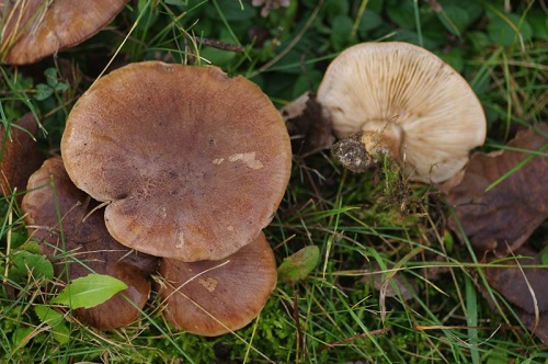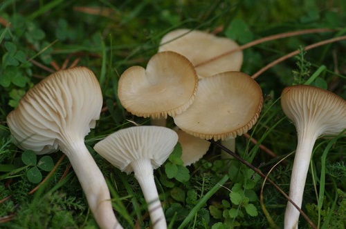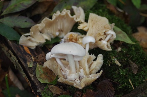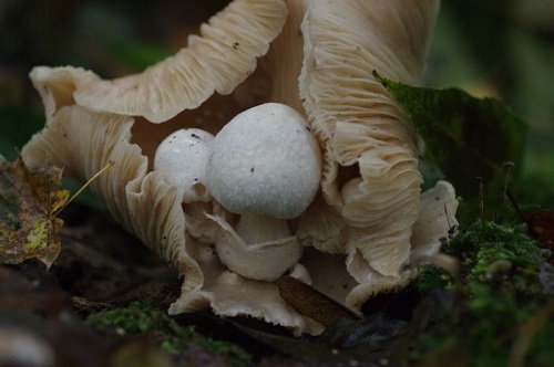 Foto: Parasitische Scheidlinge (Ungenießbar) auf einer Graukappe - Graukappen haben eine beachtliche Rate an individueller Unverträglichkeit. Die Pilze enthalten das hitzestabile Gift Nebularin, das zu heftigen Irritationen des Magen-Darm-Traktes führen kann.