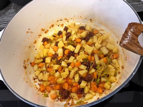 Für die Zubereitung eines Linseneintopfes werden in der Regel Speckwürfel heiß ausgelassen. Da ich mich aber nach wie vor nicht sonderlich für Speck begeistern kann, habe ich stattdessen eine würzige Chistorra, eine spanische Wurstspezialität, ausgelassen und anschließend im Topf Würfelchen von einer kleinen Roten Zwiebel, einer Schalotte und einer halben Knoblauchzehe gedünstet.
