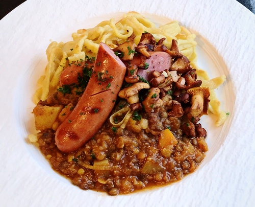 Es gab einen Linseneintopf mit dreierlei Linsen, gebratenen Pfifferlingen, selbstgemachten Spätzle und gegrillten Krakauer Würstchen vom Duroc-Schwein.
