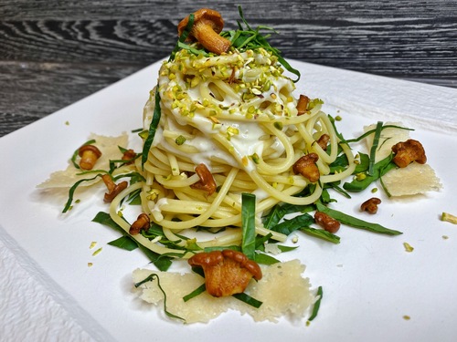 Ich habe leckere und selbstgekaufte Spaghetti mit einer feinen, selbstgemachten Gorgonzolasauce und frischem Spinat vereint. Das Ganze wurde dann mit geröstetem Pistazien-Crunch und gebratenen Pfifferlingen aus eigenem Wildfang gekrönt. ;-)