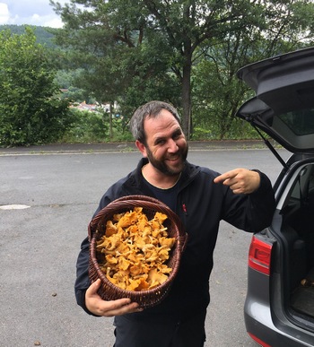 Foto rechts: Stefan zeigt einen Korb voller herrlicher Pfifferlinge. Pfifferlinge waren sein erster Pilzfund überhaupt, nachdem er vor einigen Jahren beschlossen hatte, Pilze zu sammeln. Seither hat sich sein Alltag, sein Leben deutlich verändert. Dazu gehört auch seine Kochleidenschaft, die er, wann immer möglich, mit Pilzen und frischen Zutaten möglichst aus der Region kultiviert. (Foto © Fabiano)