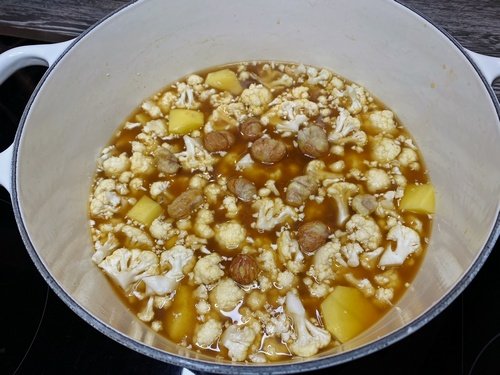 Foto: Die angesetzte Brühe mit dem Blumenkohl, den Kartoffelstücken und den Maroni.