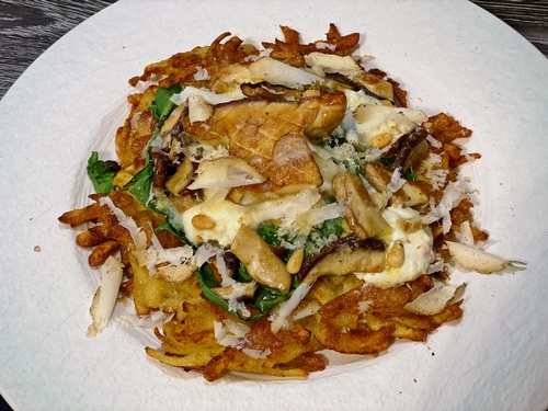 Es gab selbstgemachte rustikale Kartoffelrösti mit frischem Babyspinat, etwas Schmand, Parmesankäse, gerösteten Pinienkernen und gebratenen Steinpilzen.