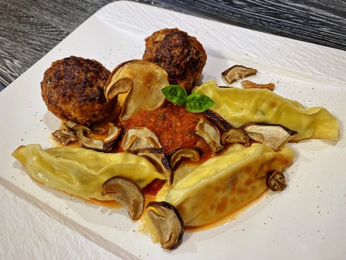 Es gab Steinpilz-Hackbällchen in frischer Tomatensauce mit mediterranen Dumplings (= Teigtaschen; in diesem Fall mit einer Ricotta-Rucola-Füllung).