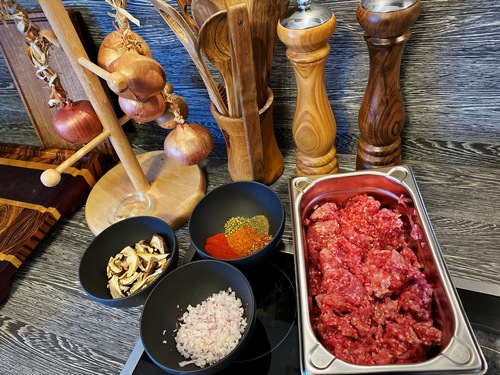 Wir haben zuerst die Steinpilz-Hackbällchen geformt und anschließend im Bräter kurz scharf angebraten. In den Bräter kam dann aus unserem Vorrat eine bereits fertige Tomatensauce aus den eigens im Garten angebauten Tomaten und Kräutern. Der Bräter ging anschließend in den Backofen zum Fertiggaren der Steinpilz-Hackbällchen.