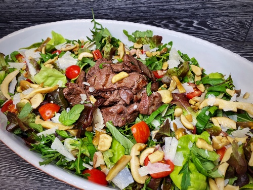 Es gab frischen Gartensalat mit kurzgebratenen Rindfleischstreifen und Grüngefelderten Täublingen. Hierzu gab es ein sommerlich frisches Dressing mit etwas Parmesan, Schmand, Aceto Balsamico Bianco und Limette.