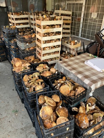 Foto rechts: Die zentrale Sammelstelle für Steinpilze. Obwohl die Pilze sichtlich alt, trockenheits- und hitzegeschädigt sind, gestattete der Betreiber Andreas ein Foto. Vielen Dank für diesen seltenen Einblick!