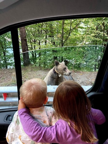 Bemerkenswert war auch, dass im Fagarasan-Gebirge Bären leben und tatsächlich entdeckten wir auch deren Kothaufen entlang einer deutlichen Wildfährte am Bachufer. Und bei der Weiterfahrt am späten Abend standen dann tatsächlich an drei Stellen Bären am Straßenrand. Zweimal eine Mama mit je 2 bzw. 3 Jungen und ein einzelnes Männchen. Hat zwar nicht direkt etwas mit Pilzen zu tun, war aber ein tolles Erlebnis, vor allem für die Kinder, die vom sicheren Beifahrersitz schauen durften (siehe nächstes Foto).