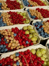 2 Fotos: Eine Schale mit Hexeneiern kostet 18 Euro. Sie scheinen sich zu verkaufen, sonst hätten die Marktfrauen sie nicht im Angebot. Eine Augenweide sind die Beerenschalen mit Blaubeeren, gelben und roten Johannisbeeren und Stachelbeeren. (5 Fotos © Thomas H.)