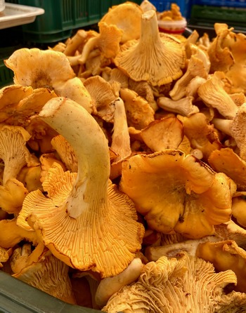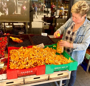 Interessant ist, dass Pfifferlinge im Baltikum quasi literweise verkauft werden, also in Behälter abgefüllt und nicht gewogen. Sie werden z. B. als "Halber Liter" deklariert (2. Foto rechts). Aber es gibt auch einen Kilopreis, und der lag bei bester Qualität, Sauberkeit und Frische (siehe 3. Foto rechts) bei rund 6 Euro.