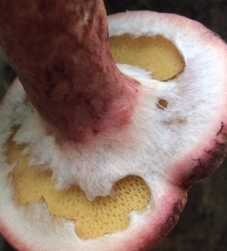 Dort habe ich einige interessante Erstfunde gemacht. Besonders habe ich mich über einen knallroten Saftling* gefreut, der mit seinen leuchtenden Farben ein echter Hingucker war. Ich tippe auf Mennigroter Saftling (Foto rechts), da er keinerlei schwärzende Elemente aufwies wie der Schwärzende oder Kegelige Saftling. Er wuchs aber im Mischwald und nicht auf Wiesen.