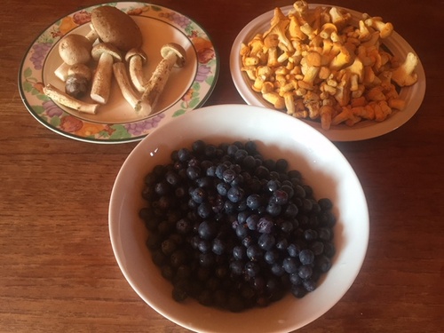 Foto: Immerhin ein paar Birkenpilze, einen Teller Pfifferlinge und eine Schale Heidelbeeren hat Wolfgang in den Wäldern von Nord-Trøndelag im südlichen Mittelnorwegen gefunden. (Foto © Wolfgang)