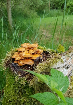 Gestern hat die 3-jährige Tochter unserer Freunde auf dem Grundstück unseres Ferienhauses in Nordjütland, Dänemark, auf einem Birkenstumpf ein Büschel Pilze ausfindig gemacht und mir voller Stolz präsentiert.