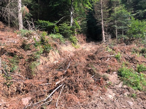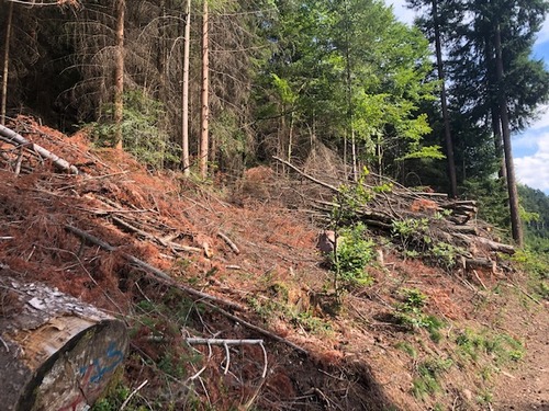 Die folgenden vier Fotos zeigen ein Waldgebiet im nördlichen Schwarzwald, in dem ich am 6. Juli war; siehe mein Tageseintrag vom 7. Juli 2022 im Pilzticker BaWue. Gefällt wurde zwar hauptsächlich Bergahorn, aber auch viele junge Fichten und Rotbuchen mit gerade mal 8-15 Zentimeter Durchmesser.